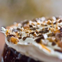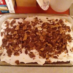 3Let cake cool completely, then top with whipped topping. Decorate the top of the cake with some more chocolate toffee bar chunks and swirls of caramel topping. Refrigerate and serve right from the pan!