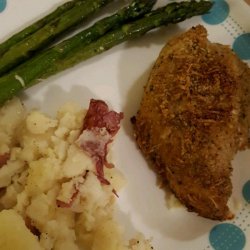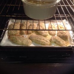 2Melt the butter with the garlic in a saucepan over medium heat. When the butter starts to bubble, remove from the heat and allow to cool slightly. Stir the breadcrumbs together with the Parmesan cheese, thyme, basil, oregano, pepper, and salt in a bowl. Dip the chicken breasts in the butter, then press into the seasoned bread crumbs. Place the chicken into a 9x13 inch baking dish.