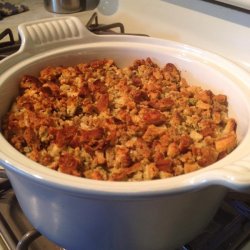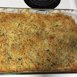 3Spread the squash mixture into a medium baking dish. Mix together stuffing and 1/2 cup melted butter, and sprinkle over the squash mixture.