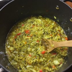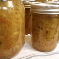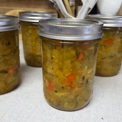 2The following day, drain the zucchini in a colander, and rinse well with cool water. Squeeze out excess water and set aside. Place the red and green bell pepper, sugar, vinegar, and cornstarch into a large pot. Add the nutmeg, turmeric, celery seed and pepper. Stir to combine, then add the drained zucchini. Bring to a boil over medium-high heat, then reduce the heat to medium-low, and simmer 30 minutes.