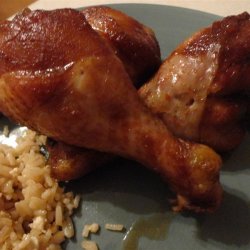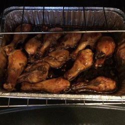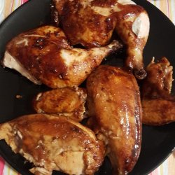 4Bake chicken uncovered in the preheated oven for 1 hour, basting frequently. Test for doneness, making sure there is no pink left in the meat. Let cool slightly, then cut into smaller pieces to serve.