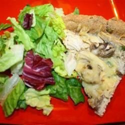 5To Assemble the Pizza: Spread dough out on prepared pizza stone. Top with cooled garlic butter, covering entire crust. Next spread with Alfredo Sauce (if necessary, warm to spreading consistency), leaving crust edges. Top with chicken, turning to coat with sauce.