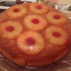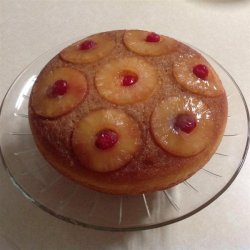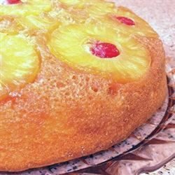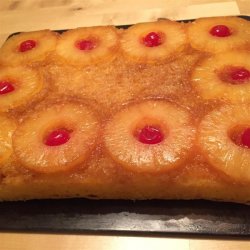 1Melt the butter over medium high heat in the iron skillet. Remove from the heat and sprinkle the brown sugar evenly to cover the butter. Next, arrange pineapple rings around the bottom of the pan, one layer deep. Place a maraschino cherry into the center of each pineapple ring. Prepare the cake mix as directed by the manufacturer, substitute some of the pineapple juice for some of the liquid in the directions. Pour the batter over the pineapple layer.