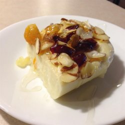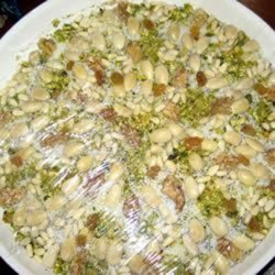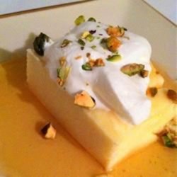"This is a cold semolina pudding with caramel syrup sauce and pistachio nut topping. The recipe is from my mother. If you do not wish to use rose water, you can substitute with 2 teaspoons of vanilla."