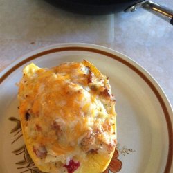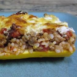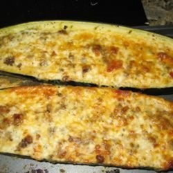 4Slice the zucchini in half lengthwise, remove the seeds and rinse. Place both halves in prepared baking dish and sprinkle with garlic salt. Layer the sausage, tomatoes and cheese mixture in each half.