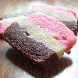 1In a medium bowl, cream together the butter and sugar. Stir in the eggs and vanilla. Combine the flour, baking powder, and salt; stir into the creamed mixture. Divide dough equally into three small bowls. Add almond extract and red food coloring to one portion; stir until thoroughly mixed. Mix chocolate into second bowl, and walnuts into the third bowl.