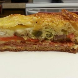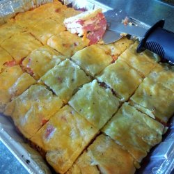 2Unroll one package of crescent roll dough, and cover the bottom of a 9x13 inch pan. Layer the ham, provolone cheese, Swiss cheese, salami, pepperoni, and red peppers, on top of the dough.