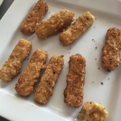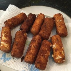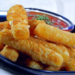 4One at a time, coat each mozzarella stick in the flour mixture, then the egg mixture, then in the bread crumbs and finally into the oil. Fry until golden brown, about 30 seconds. Remove from heat and drain on paper towels.