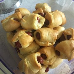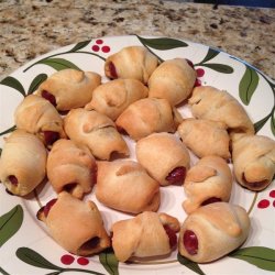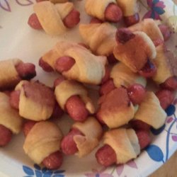 2Separate crescent rolls. Flatten rolls and cut into triangles which measure 1 1/2 inches on each side. Wrap each sausage in a triangle of dough. Place on prepared baking sheet.