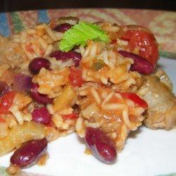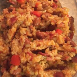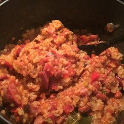 1Heat oil in a large saucepan over medium heat. Saute onion, green pepper and celery, until onions are soft and translucent. Stir in garlic, and cook another minute. Add rice, sausage and ham. Cook 2 to 3 minutes, to coat the rice with oil, stirring frequently. Pour in tomatoes with green chiles and chicken broth. Season with thyme and bay leaf. Bring to a boil, then reduce heat. Cover, and simmer 20 to 25 minutes, or until liquid is absorbed. Stir in the beans, mix well and heat through.