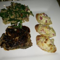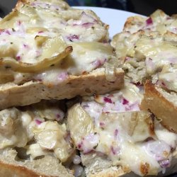 2In a medium bowl, mix marinated artichoke hearts, Romano cheese, red onion and mayonnaise. Top French baguette slices with equal amounts of the artichoke heart mixture. Arrange slices in a single layer on a large baking sheet.