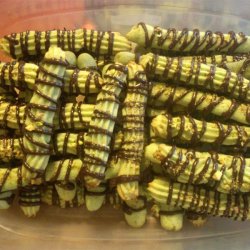 4In small saucepan over low heat, melt together chocolate and shortening, stirring constantly until smooth and well blended. Drizzle a small amount of chocolate over each cookie. Allow the chocolate to set before storing.