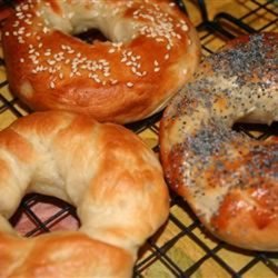 5Bake at 375 degrees F (190 degrees C) for 20-25 minutes. Remove from sheets and cool. If desired, before baking, mix 1 egg white and 1 tablespoon water, brush on bagels, and sprinkle with sesame, poppy, or caraway seeds.