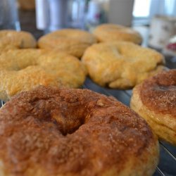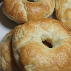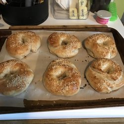 4Divide dough into 12 pieces; shape 3 pieces into smooth balls. Poke a 1 inch hole in each. Drop bagels into a large skillet with 1 inch water (simmering) with 1 tablespoon sugar and 2 teaspoons salt in the water. Cook on medium low heat for 3 minutes, turn and cook 2 minutes; turn again, cook 1 minute more. Drain on towels. Repeat for rest of dough. Place on greased cookie sheet.