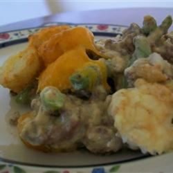 2In a large skillet over high heat, brown the ground beef and drain fat. Stir in condensed cream of mushroom soup, skim milk, garlic salt and green beans. Pour the mixture into a medium-sized casserole dish and layer with the tater tots.