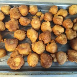 5Drop 6 to 8 tablespoon-sized balls of batter into the hot oil; fry until each hush puppy is golden brown, turning the hush puppies to cook evenly, 6 to 10 minutes. Remove hush puppies with a slotted spoon and place on brown paper bags to drain. Repeat with any remaining batter.
