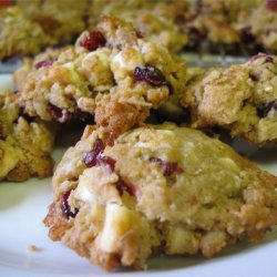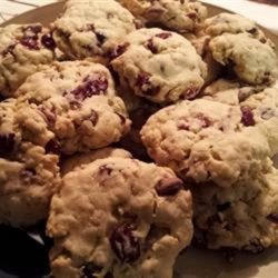 2In a medium bowl, cream together the butter and sugar. Beat in the eggs one at a time. Combine the rolled oats, flour, whole wheat flour, baking soda and salt; gradually stir into the creamed mixture. Finally, stir in the cranberries, white chocolate chips and chocolate chips. Drop by rounded spoonfuls onto the prepared cookie sheet.