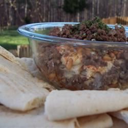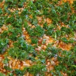 "For this delicious dish, we layer a little hummus on the bottom of a casserole dish, then add the pita pieces, then the rest of the hummus with toasted pine nuts, lemon juice, and parsley. We don't make this dish topped with ground beef, but that's the way it's served in most Arab homes. If you choose this option, simply cook some ground beef with salt and diced onion and layer it on top."