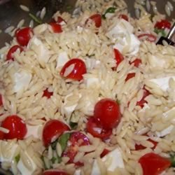 "A take on a traditional Caprese, but modified into a light summer pasta salad that goes great with anything off the grill, or just on its own. When I eat it on its own, I sometimes add about a cup of any chunked, cold sausage (I suggest pepperoni or a lighter summer sausage). Any pasta is fine, but I like the orzo's size.