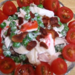 2In a large bowl, mix together the imitation crab, bacon and peas. Stir onion powder into mayonnaise, and then stir into the crab mixture until well blended. Cover and refrigerate. Top with diced tomatoes before serving.