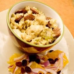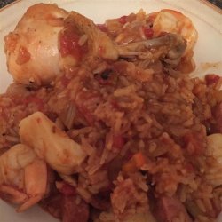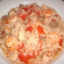 1Select a medium-high setting for an electric skillet; heat oil in hot skillet. Cook onion in oil until soft. Stir in tomatoes, chicken, and sausage. Season with garlic powder, hot sauce, salt, and pepper. Stir in rice, pour in broth, and add shrimp.
