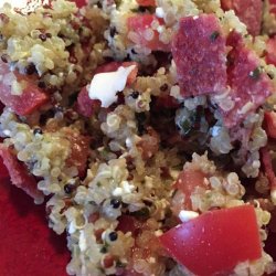 2Stir pesto, tomatoes, feta cheese, and bacon into the quinoa.