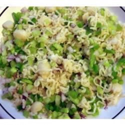 2In a large bowl, combine the noodles, celery, water chestnuts, red onion, bell pepper and peas.