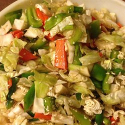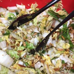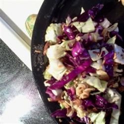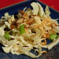 1In a medium skillet over low heat brown ramen noodles, almonds, and sesame seeds with melted butter or margarine. Once browned, take off heat and cool.