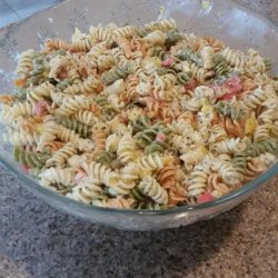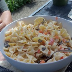 2In a large mixing bowl, whisk together mayonnaise, vinegar, salt, black pepper, and garlic until well blended. Mix in basil. Add pasta, tomatoes, bell peppers, and olives; fold gently until mixed. Chill several hours. Stir gently before serving.