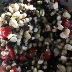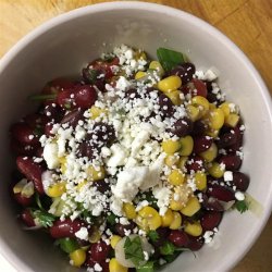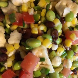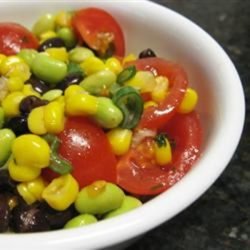 "Edamame (green soybeans), corn, cherry tomatoes and black beans combine to make a colorful salad with a light lime vinaigrette dressing."