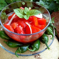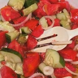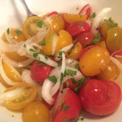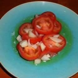 2In a large bowl, toss together tomatoes, onion, sugar, vinegar, oil, salt, and pepper. You may adjust the amounts of vinegar and sugar according to your taste. Serve at room temperature.