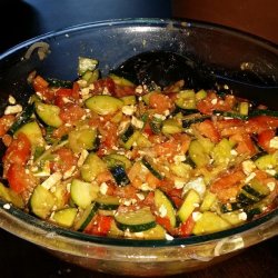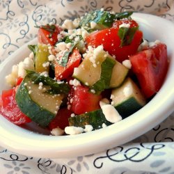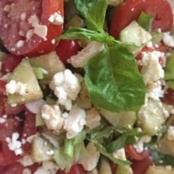1In a large bowl, toss together the tomatoes, cucumber, green onions, basil, olive oil, balsamic vinegar, and feta cheese. Season with salt and pepper.