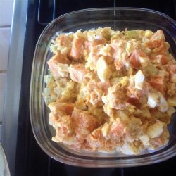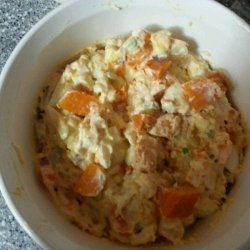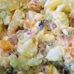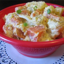 4Whisk together the mayonnaise, mustard, salt and pepper. Add to potato mixture, toss well to coat. Refrigerate and serve chilled.