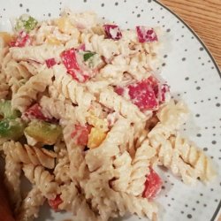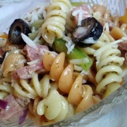 2In a large bowl, combine the pasta, Italian salad dressing, Caesar dressing, Parmesan cheese, red bell pepper, green bell pepper, and red onion. Mix well and serve chilled or at room temperature.