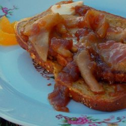 5Grease heated griddle with frozen butter. Cook dipped bread slices on the hot buttered griddle until browned, 2 to 3 minutes per side. Repeat with remaining frozen butter and dipped bread. Serve French toast with apple mixture ladled over top.