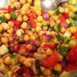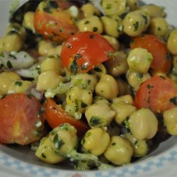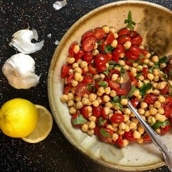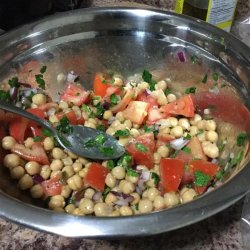 In a large bowl, combine the chickpeas, red onion, garlic, tomato, parsley, olive oil, lemon juice and salt and pepper to taste. Chill for 2 hours before serving. Taste and adjust seasoning. Serve.