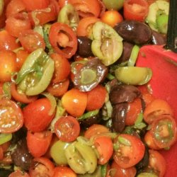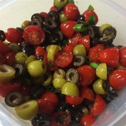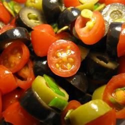 1In a big bowl, combine cherry tomatoes, green olives, back olives, and spring onion.