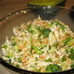 "A mixture of cole slaw, green onions and broccoli combined with a dry mixture and a delicious dressing to create a wonderful salad that everyone will want the recipe for. Great for family, church, or barbeque gatherings!"