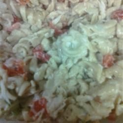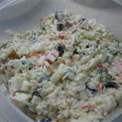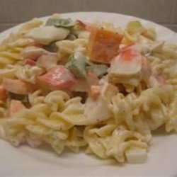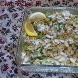 "This creamy and colorful salad is inexpensive and flavorful. Seashell macaroni and crab meat are dotted with a delicious blend of herbs, green pepper, olives, radishes, tomato and celery. If you don't have celery on hand, just substitute some celery seed instead for flavor!"