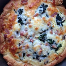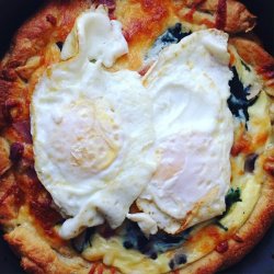 "This recipe will make two pizzas. I came up with it by accident by throwing a bunch of ingredients together. We make it on the weekends at the lake for breakfast/brunch. You can modify toppings. I usually make one sausage and one bacon. Each pizza will serve 3 to 4 people."