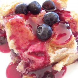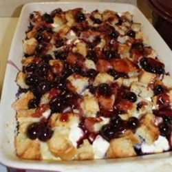 1Coat a 9x13 inch baking dish with cooking spray. Place 1/2 of the bread cubes in dish; top with 1 1/2 cups blueberries. Scatter cream cheese over berries. Cover with remaining bread cubes. In a mixing bowl, whisk together eggs, maple syrup, and milk. Pour egg mixture over bread in pan. Cover, and chill overnight.