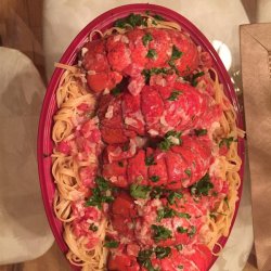 6Drain the spaghetti and place on a large serving plate. Stir in the remaining butter and garlic. Pour the tomato sauce over the spaghetti and arrange the two lobster halves in the center. Sprinkle all over with parsley and serve.
