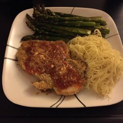 "Even the kids love it! Thin chicken breasts are dusted in bread crumbs (seasoned with Parmesan cheese, basil, and oregano), then baked for 10-12 minutes. Top with mozzarella, return to oven for 1 minute. Serve with a favorite organic spaghetti sauce."