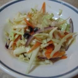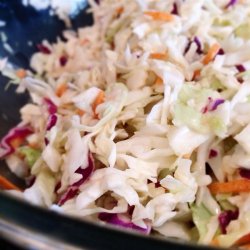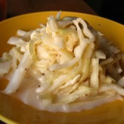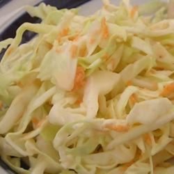 "Shredded cabbage is tossed in a tangy dressing in this quick five-ingredient coleslaw."