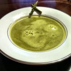 4Pour in vegetable broth and bring to a boil. Reduce heat and simmer until asparagus is tender, about 10 minutes. Turn off heat and allow to cool slightly.