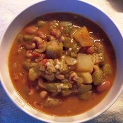 5Stir the serrano, banana, and jalapeno chile peppers, along with the uncooked bell peppers and onions, garlic, Cajun seasoning, smoked paprika file powder, into the cooked bell peppers and onions. Stir the roux and 1 cup of stock into the vegetable mixture until the roux dissolves. Cover and simmer 5 minutes. Add the tomatoes, sweet potato, parsnip, red beans, black-eyed peas, okra, and remaining stock. Simmer uncovered 30 minutes more. Season to taste with salt and pepper.