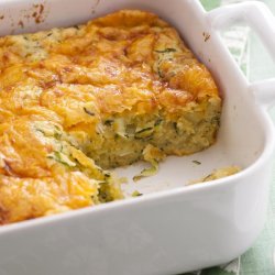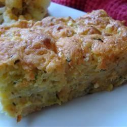 2In a large bowl mix together the zucchini, onion, eggs, muffin mix, salt and pepper. Stir in 4 ounces of the cheese. Spread this mixture into a greased 2 quart casserole dish; top with remaining 4 ounces of cheese.