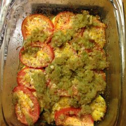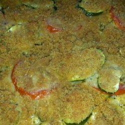 3Arrange half of the zucchini slices in the pan. Sprinkle 1/4 of the cheese and herb mixture on top. Arrange half of the tomatoes, and top with another 1/4 of the cheese mixture. Repeat layers.