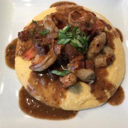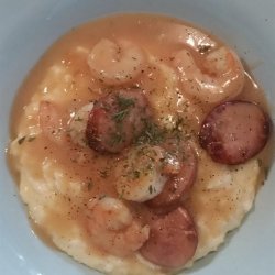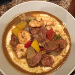 9Just before serving, mix sharp Cheddar cheese into grits until melted and grits are creamy and light yellow. Serve shrimp mixture over cheese grits.