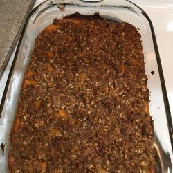 4In a separate bowl, mix the brown sugar, chopped pecans, flour, and 1/3 cup melted butter. Sprinkle over the sweet potato mixture.